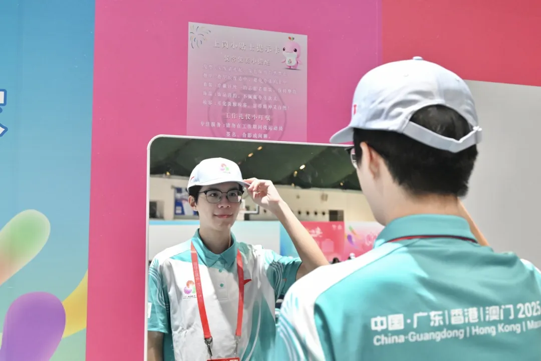 志愿者对镜整理仪容仪表