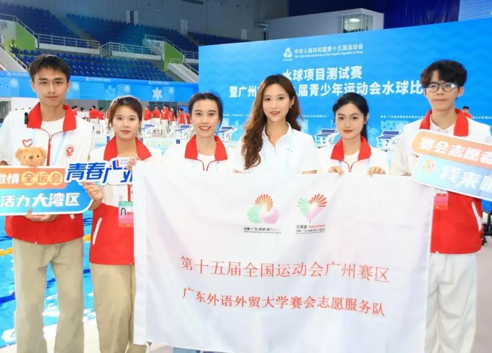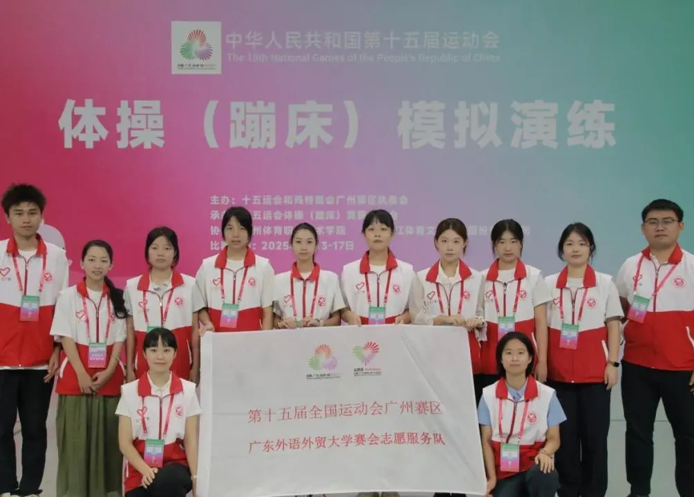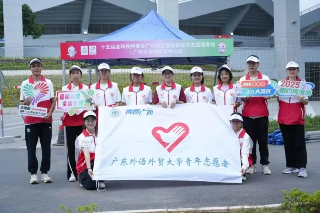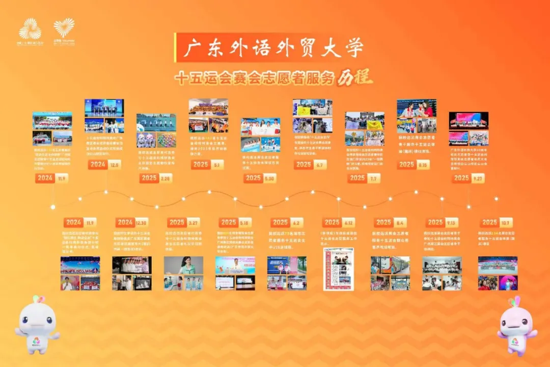 自 2024 年 11 月起,我校已经开展十五运会及残特奥会志活动的筹备工作,近一年来,广外人精益求精,以最饱满的热情,最专业的训练,静待八方来客,誓以青春之名,为全运添彩。让我们循着时间的脉络,共同回顾广外“小海豚”志愿者服务十五运会的历程和成长之路。