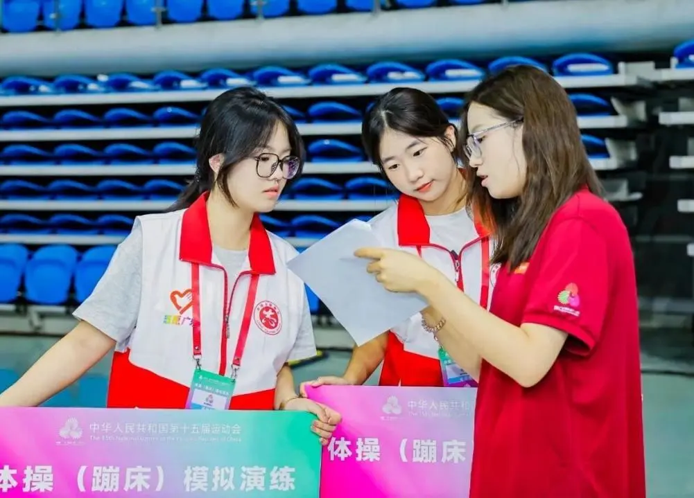 2025年8月15日至17日,我校选派2名领队老师、10名赛会志愿者骨干服务十五运会体操(蹦床)模拟演练。