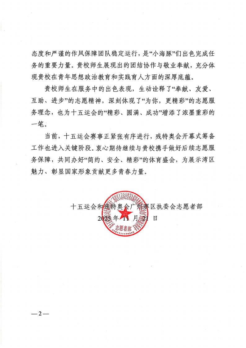 2025年十五运会和残特奥会广州赛区执委会志愿者部感谢信