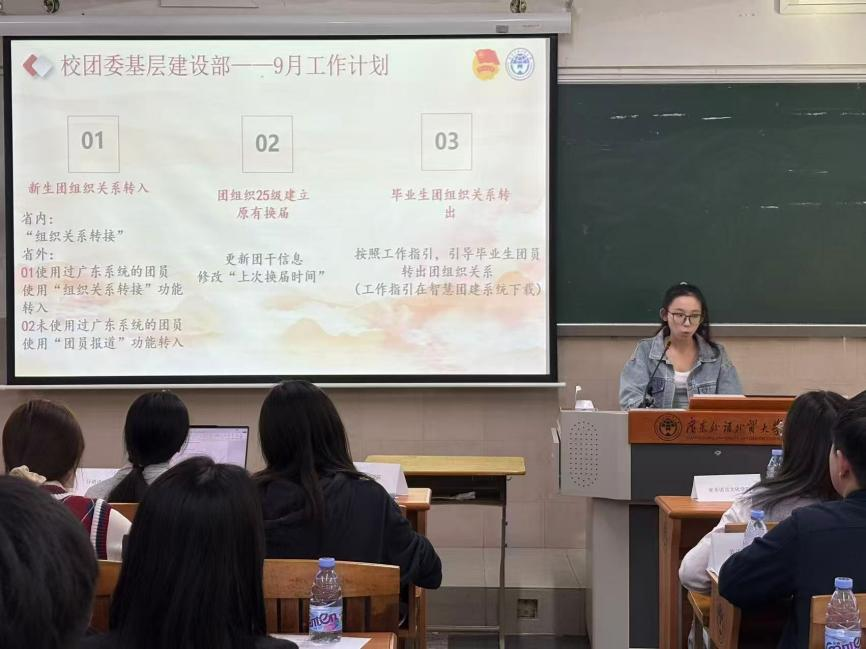 基层建设部代表率先发言,对团员发展、团内评优评先、智慧团建系统操作及日常升旗管理等方面做了相关的培训。会议以时间线形式清晰介绍了团员发展的整体安排,详细解读了入团流程,并特别强调了2025级学生入团的相关注意事项与文书书写规范,尤其对《入团志愿书》填写的常见问题进行了逐项说明。