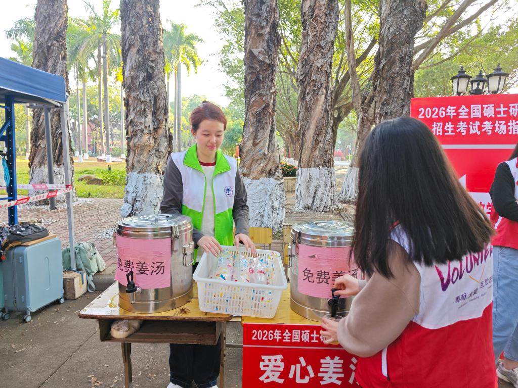 西方语言文化学院的本科生王艺诺是六教考生存放物品点的组长,确保每一位同学按时上岗,有序提供存放服务。当考生们带着紧张又期待的神情前来存包时,组员们一边快速核对考生考场信息、妥善放置物品,一边轻声送上祝福。从上岗前的培训,到为考生耐心解答疑问,每一个环节都凝聚着团队的默契。闲暇时王艺诺还负责看管爱心姜汤摊位。“我真切感受到了志愿服务的温度,当看到考生们放下顾虑奔赴考场的背影,我满是成就感。”她说道。