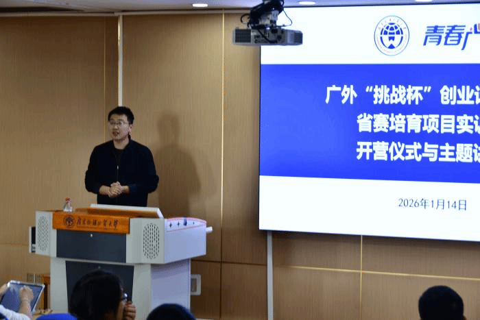 本网讯 2026年1月14日,由校团委主办的2025-2026学年“挑战杯”广外大学生创业计划竞赛金奖培育项目实训营开营仪式暨首场主题讲座在大学城校区教学楼B栋409顺利举行。校团委挂职副书记薛达老师、校团委专职团干刘天阳老师、企业专家朱文龙老师及校赛金奖团队代表齐聚现场,共同开启系统化备赛实训之旅。本次实训营是学校精准对接“挑战杯”省赛备赛需求的重要举措,旨在通过整合校内外优质资源,为参赛团队提供全流程、专业化指导,助力项目提质增效、冲击省赛佳绩。