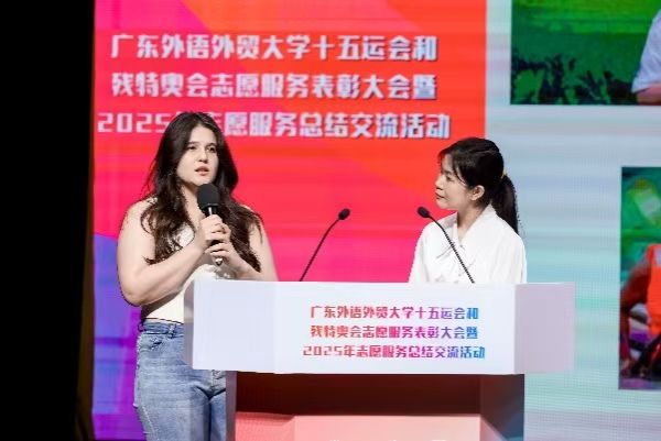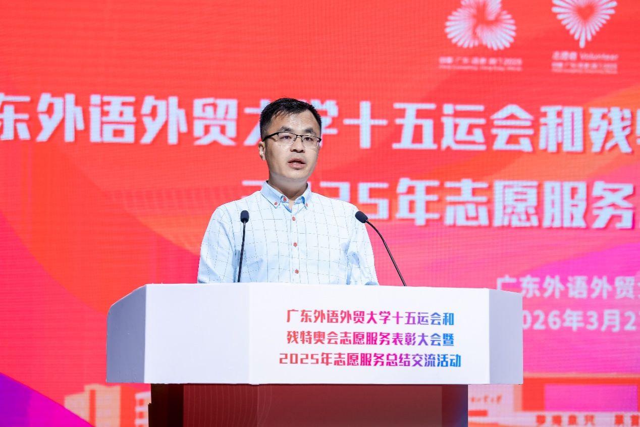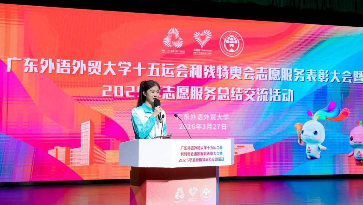 3月27日,广东外语外贸大学十五运会和残特奥会志愿服务表彰大会暨2025年志愿服务总结交流活动在白云山校区明德报告厅举行。各二级学院党委副书记、团委书记、十五运会和残特奥会领队老师和志愿者,以及各专项工作志愿者代表出席活动,共同回顾过去一年我校在志愿服务工作中的成果与感悟,表彰在志愿服务中涌现出的先进个人与集体。