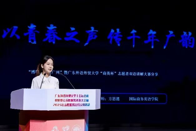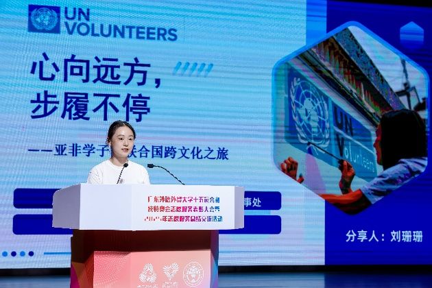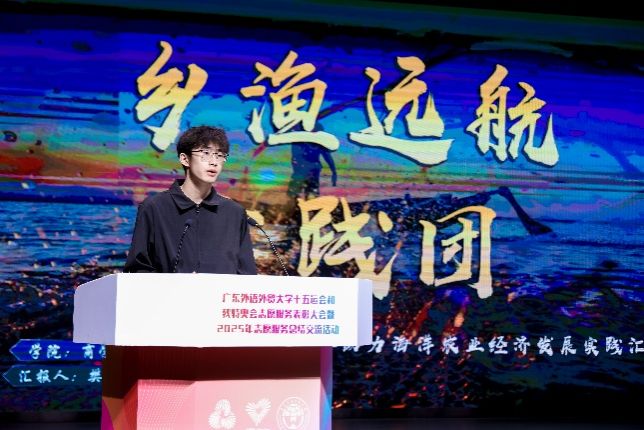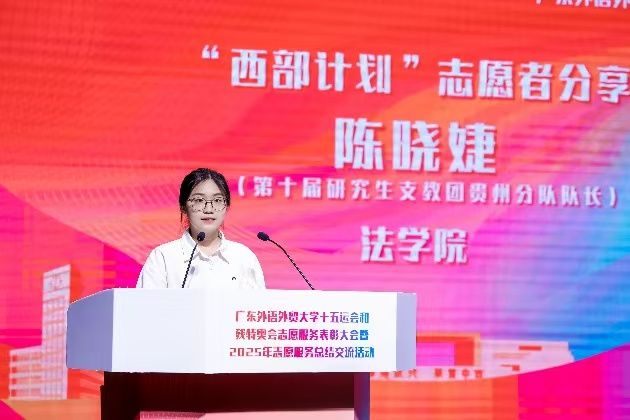 此外,来自“百千万工程”突击队、西部计划、大学生社区实践计划和联合国服务项目的5位志愿者代表,分享了他们深入基层、服务社会、参与国际志愿服务的实践经验和成长故事,生动展示了广外青年在各领域勇担使命、奋勇争先的风采与担当,为在场学子树立了榜样。来自商学院“乡渔远航实践团”的团队代表分享了通过专业助力乡村振兴,用实际行动推动社会发展。新闻与传播学院的“粤见清新”实践团通过与留学生对话的方式,向世界展现广东高质量发展的生动实践。西部计划研究生支教团志愿者代表,法学院研究生陈晓婕分享了她在西部支教的感人故事,温暖的情感与坚定的初心感染了在场的每一位。国际商务英语学院的“双语博物馆讲解项目”充分发挥专业语言优势,搭建起文化沟通的桥梁,让文物“活”起来,让历史“走”出去,让更多人感受中华优秀传统文化的魅力。联合国项目志愿者代表,亚非学院印地语专业研究生刘珊珊分享了在在尼泊尔“RiseUp4Peace”项目中,深入调研当地青少年心理健康现状,结合实际需求提出针对性干预方案,为当地青少年心理健康事业贡献智慧与力量,尽显中国青年的国际担当。