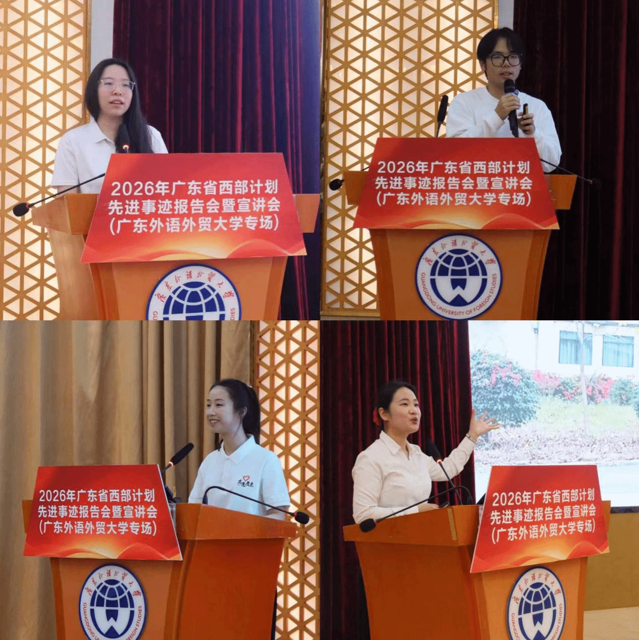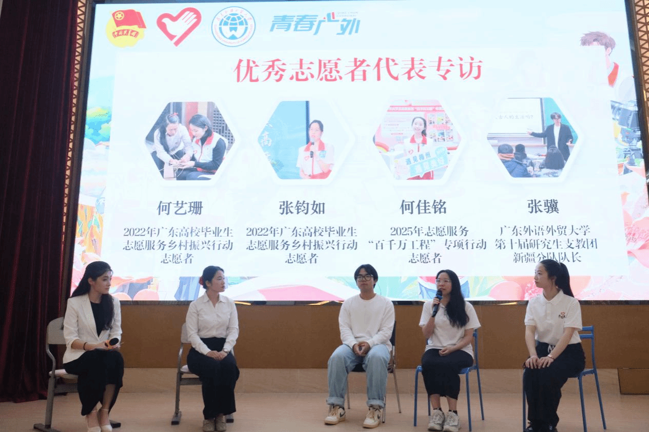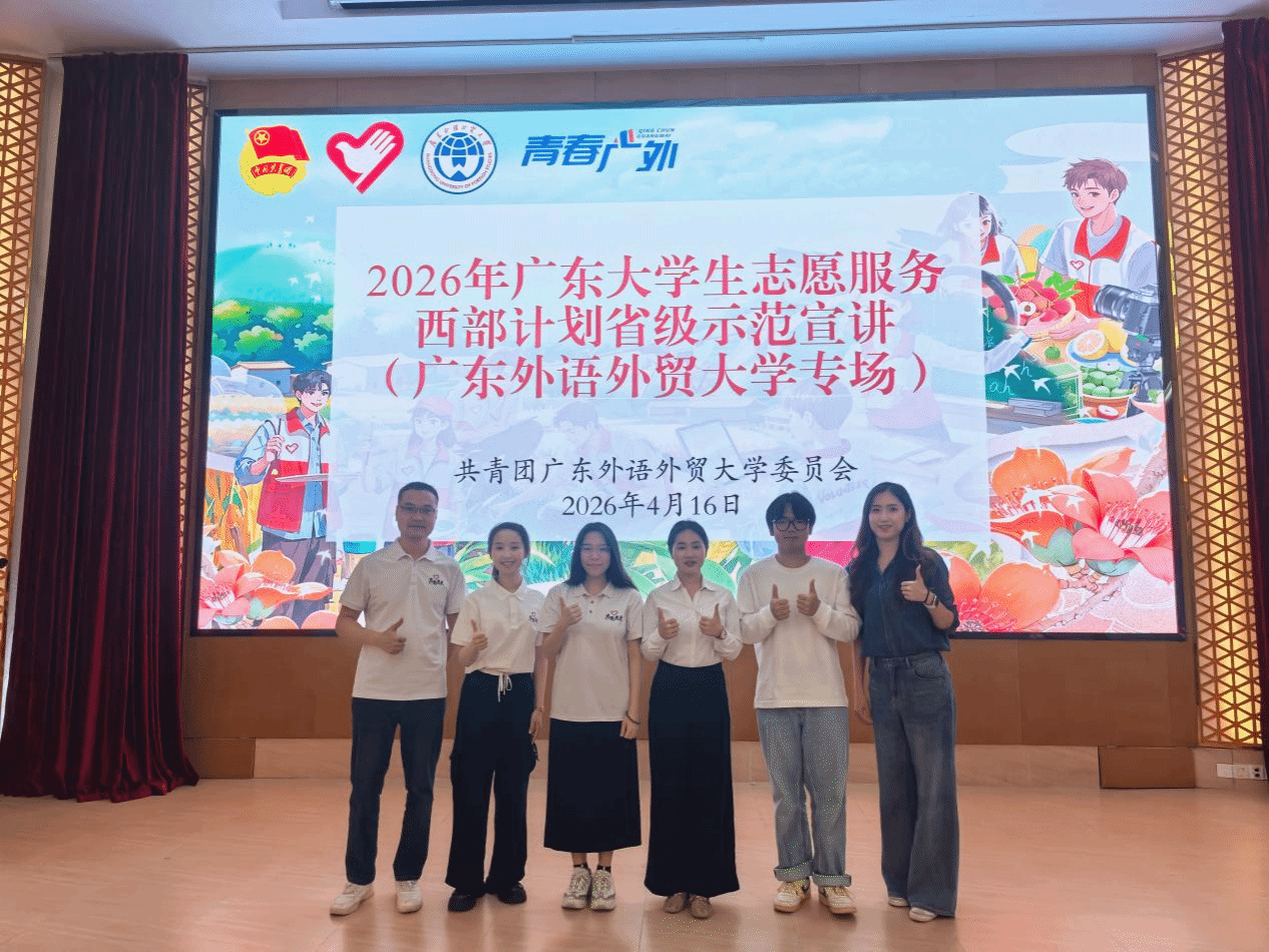 4月16日,2026年广东省西部计划先进事迹报告会暨宣讲会(广东外语外贸大学专场)在我校大学城校区顺利举行。西部计划广东项目办吴雪彬、校团委吴怡出席活动,百余名师生到场聆听,共赴一场青春与奉献的精神之约。