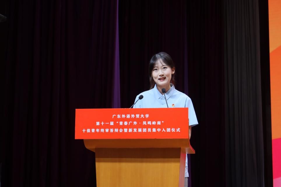 本网讯 为全面落实“新时代立德树人工程”,传承弘扬新时代广外精神谱系,集中展示我校青年学子“知校、爱校、荣校、强校”的青春担当,4月23日下午,我校在大学城校区举行广东外语外贸大学第十一届“青春广外·凤鸣岭南”十佳青年终审答辩会暨新团员入团仪式。校党委副书记葛小月出席活动并讲话,校关工委副主任许国彬、组织部、宣传部、学工部、学生就业创业中心相关同志、各学院党委副书记、团委书记、学生代表共同参与,见证榜样力量与青春荣光。