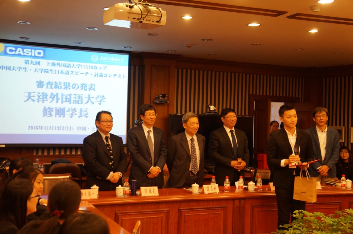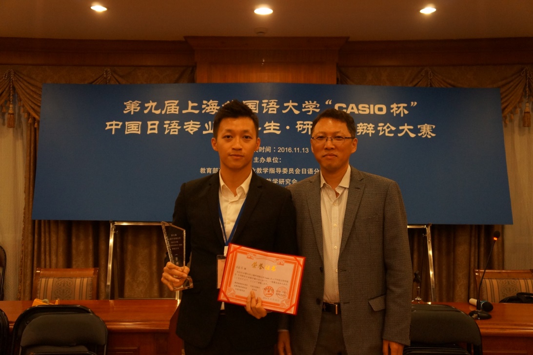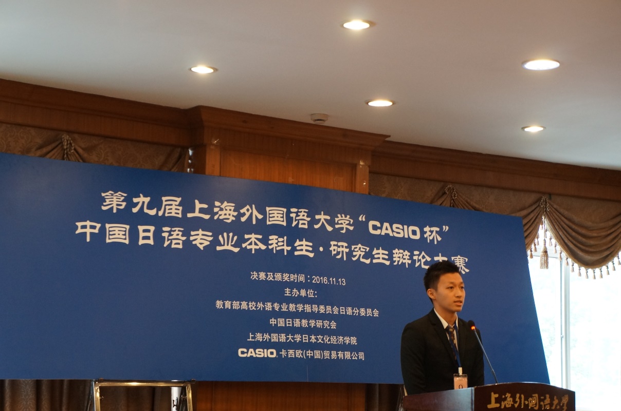 本网讯 2016年11月13日,由教育部高校外语专业教学指导委员会日语分委员会、中国日语教学研究会、上海外国语大学日本文化经济学院和卡西欧(中国)贸易有限公司联合主办的第九届上海外国语大学“CASIO杯”中国日语专业本科生·研究生演讲辩论大赛在上海外国语大学成功举行。我校日语专业本科四年级黄嘉伟同学以出色的发挥荣获一等奖。