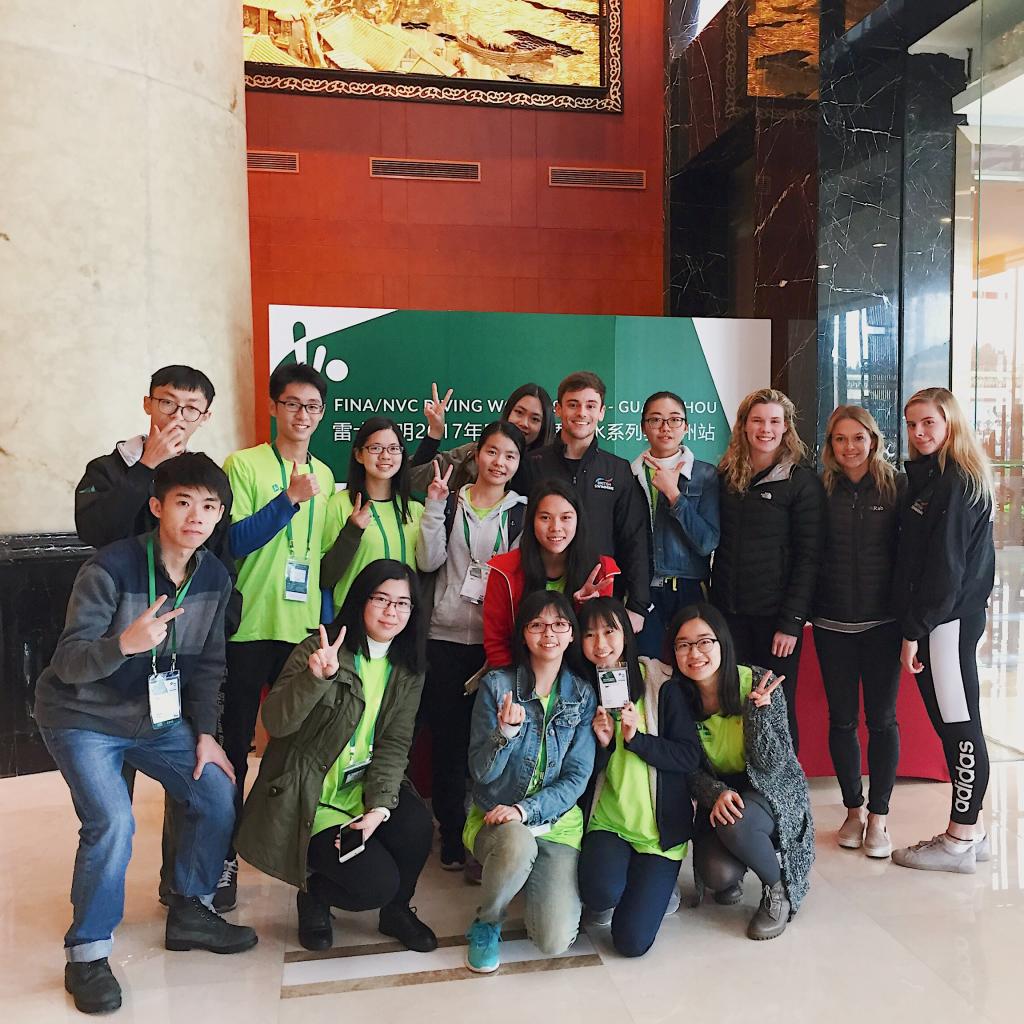 我校组织15名外语专业志愿者于2017年3月5日至12日全天协助赛事期间的相关工作。为此次会议提供了赛时参赛人员接待、国际泳联贵宾的联络及陪同翻译、国际裁判的接待及服务、酒店信息台的问询、交通、运动队服务等志愿服务。