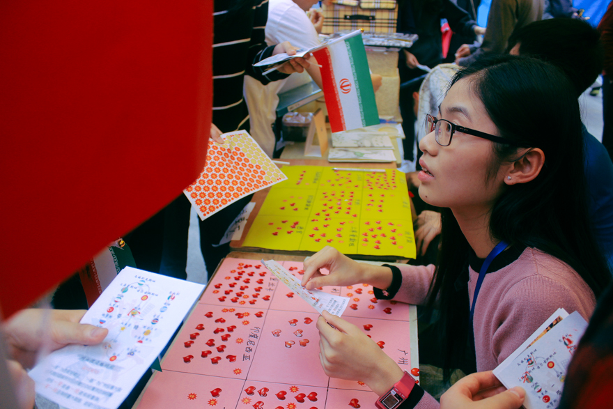 代表吉尔吉斯斯坦的是高级翻译学院,他们不仅针对吉尔吉斯斯坦的域文化进行了知识竞答游戏,还在摊位设计上结合了中国元素,设置奖品也是结合中国诗词元素的书签和明信片。志愿者关同学表示,这些活动结合两国文化体现了两国之间的合作与联系,还能提高中国的诗歌文化关注度。