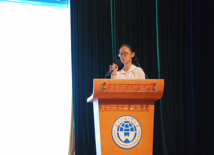 紧接着,是调研成果展示。Cosisters 队伍代表上台展示了他们社会实践的调研过程和成果。他们通过问卷调查、访谈和实地调研等多种形式,对广州市公安机关涉外服务的翻译需求情况进行调研。调研结果显示,公安机关涉外工作人员语言培训机制并不完善,对掌握专业外语的工作人员有一定需求。除完善语言机制外,他们还认为高校需密切联系市场需求,调整教学计划。高校不仅要以学生的语言训练为重点,还要同时提高学生综合素质。
