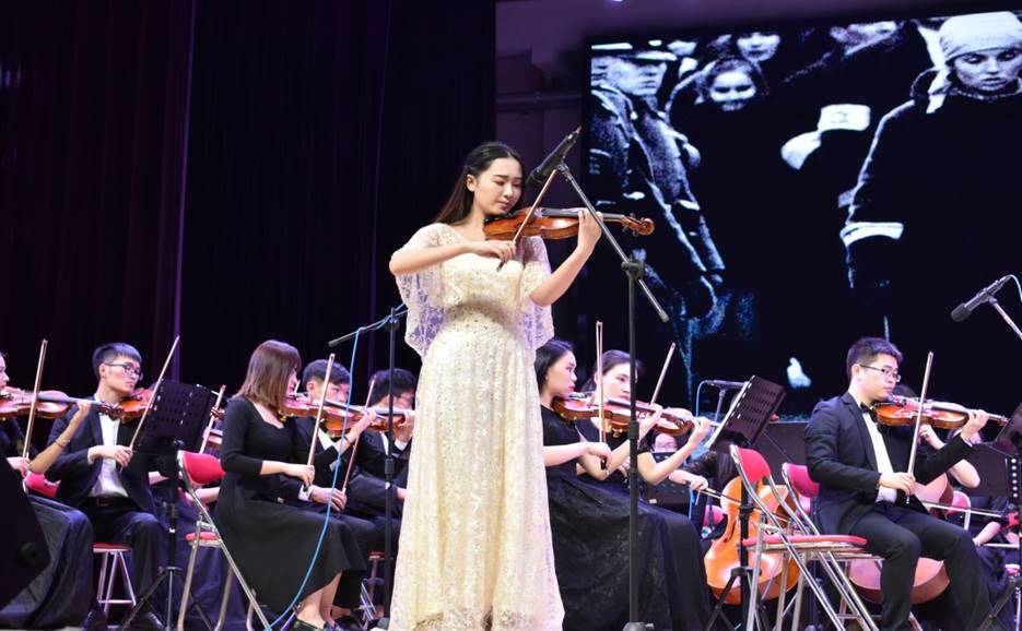随着《悲惨世界》的曲调缓缓响起,娓娓道来的旋律仿佛向讲述了穷苦农民冉阿让的赎罪之旅,让人在善与恶的交锋中思考道德和正义的本质。《辛德勒的名单》由校学生管弦乐团和陈瑗同学共同演奏,在悲伤和阴暗的色彩之下,又留有希望的微弱光芒。而《加勒比海盗》更是将弦乐器与打击乐器结合,时而高昂雄壮、时而轻巧优柔,风格多变,令人惊叹。紧张而又连贯的交响曲旋律将战争的符号融于五线谱,让观众仿佛在加勒比海峡中,目观耳听,享受精神上的珍馐。