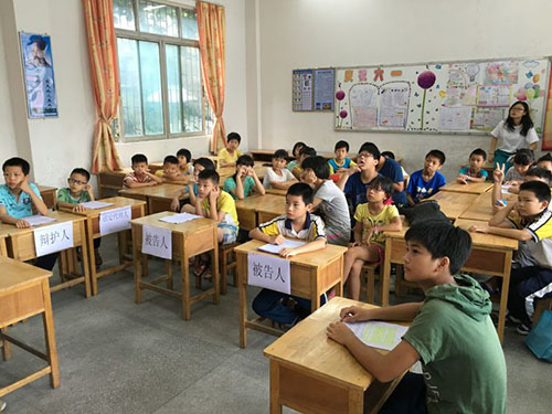 此次三下乡社会实践中,担起教书育人任务的不仅是义教组,还有我们的普法组。说起普法组,这是广东外语外贸大学法学院三下乡服务队伍的独有小组,主要负责基地及其附近地区的法律宣传工作,力求将我们法律人的精神传播得更远更广。