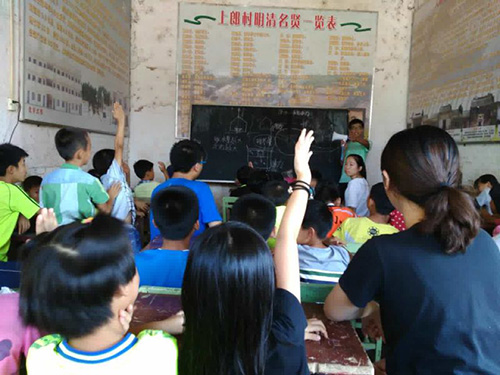 上午吃过早餐后,义教组前往位于纪家镇上郎村祠堂的小草书屋继续开课,今天主要讲授的是趣味物理、天文学和趣味英语。为了更好地授课,教授物理的队员邓金兴特意向全队队员借了几个盆作为教学道具,天文和英语课也是生动有趣,小朋友都积极和老师互动。
