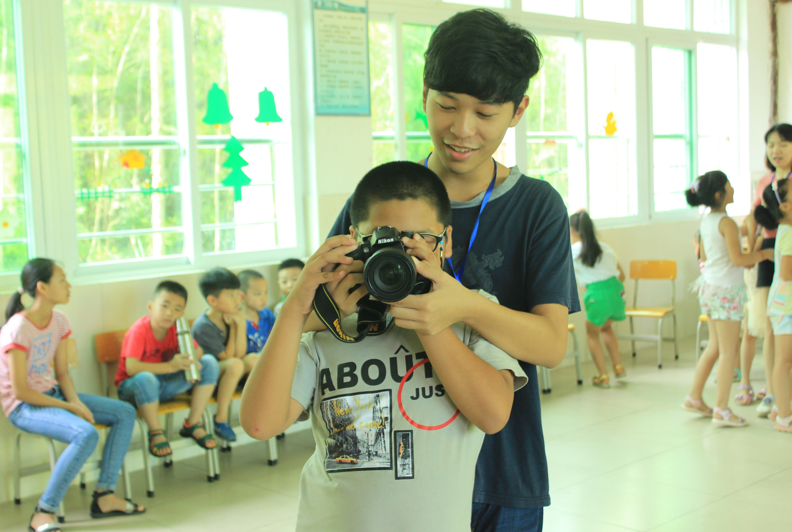 宣传队员首要的一个工作是随行跟拍。队员们按照工作安排,一部分时间,跟着义教组,捕捉义教队员与孩子们生活的点点滴滴;一部分时间,跟随调研组,记录调研工作中的大小收获。他们甚至比义教、调研的工作更辛苦。义教队员上完自己的课就可以休息了,但他们不能,这节课下课了,又要跟拍下一节课,有时候忙得连水都没能喝上一口;调研队员顶着风吹日晒,日行百里,而对于随行的宣传队员可不仅仅是头上的烈日骄阳和遥远的路途,他们还要背负沉重的照相机和三脚架,一路前行,一路拍摄。