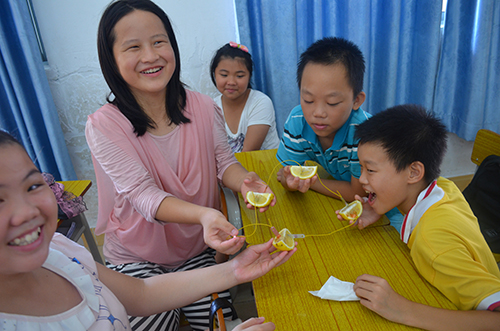 本日的重头戏是“水果电池”,这个课程义教组的组员们已经准备许久了。他们特别从网上订购了试验用的电池,买来黄绿色的柠檬。上课了,铜、锌与酸相遇,小灯泡神奇点亮。这放飞了小朋友心中的遐想,将小朋友带进奇妙的物理世界当中,一张张稚嫩的脸上透露出对世界奥秘的好奇。仅仅是站在他们身边,义教组的老师们也能体会到小朋友们那发自内心的欢欣。