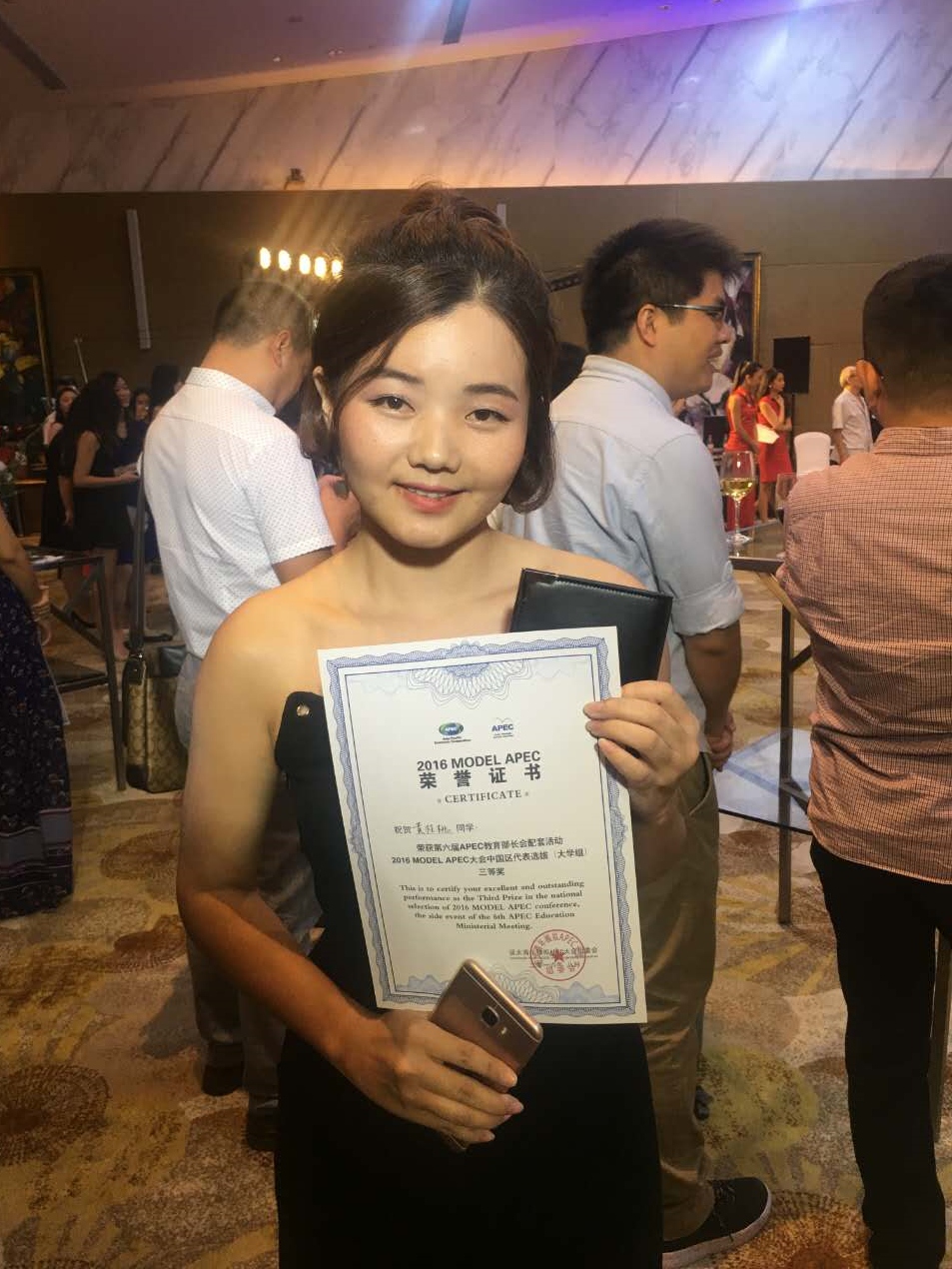 最终,我校杨楚琳、黄桂桃、杨家玮成功晋级全国11强,黄桂桃获得三等奖(全国八强),我校获得2016MODEL APEC大会中国区代表选拔(大学组)优秀指导高校奖,校团委指导老师吴怡获得优秀指导老师奖。
