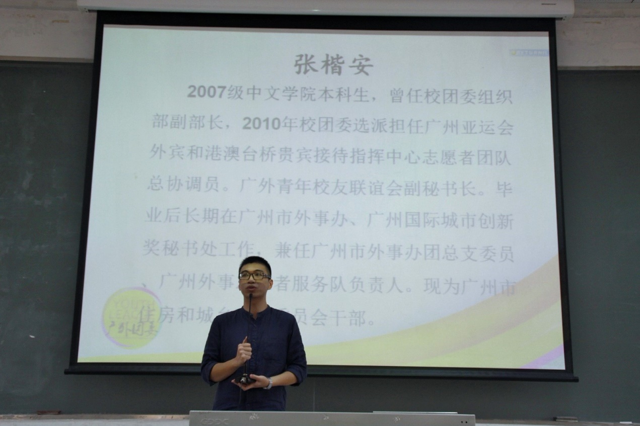 下面来到青年校友经验分享的环节,团组织安排了曾任校团委组织部副部长的07级毕业生张楷安和曾任校团委宣传部执行部长的09级毕业生周贤钜进行自身学习、工作经历的分享。其中张楷安着重强调了表达能力和尊重他人的重要性,不管在哪,这两点都将是一个追求成功的人进行社交与合作的钥匙。