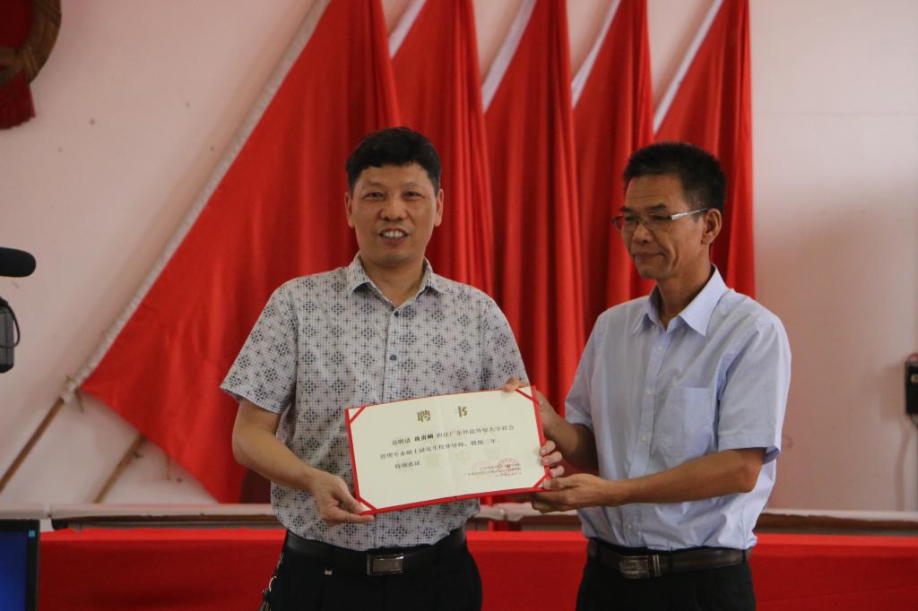 然后,学院领导向水边镇党委书记肖贞响授予校外导师的荣誉称号,肖书记表示,自己很荣幸终于成为广外的一员。