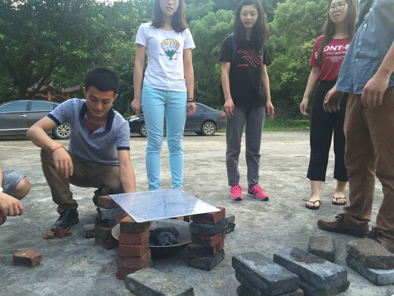 政府人员和同学们一起架烧烤炉