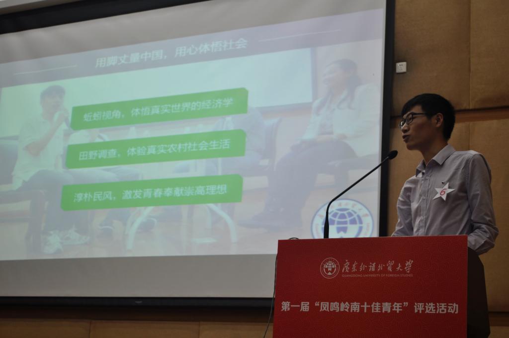 经贸学院胡天霖讲述了三年来,他用专业理论调研解决农村社会保障、农村小额信贷等课题,足迹遍布广东、山西、山东等地。用脚步丈量中国,用心灵体悟社会。他说,他喜欢在乡村实地调研中所遇到的人和事,大量鲜活的案例使得干巴巴的数据不再冷冰冰二居委温暖的温度。通过调研能体悟真实世界的经济学,体验真实农村生活,激发大学生青春奉献的崇高理想。