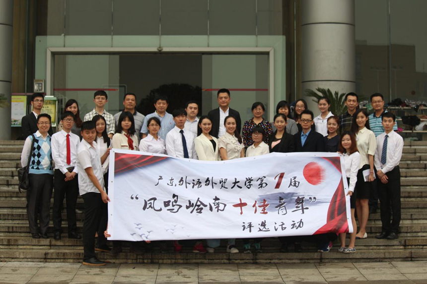 广外学子青春飞扬,宛如凤凰高鸣于岭南之地。广东外语外贸大学“凤鸣岭南十佳青年”评选活动源于已成功举办四届的“共青团之星”评选活动。2016年经广泛征求意见,正式更名为“凤鸣岭南十佳青年”评选活动。活动旨在树立、表彰和宣传评选在学术学习、科技创新、文艺体育和公益志愿等方面表现突出的广外学子。从而进一步营造促进青年学生健康成长、成才发展的文化氛围,以十佳青年为示范榜样引导广外学子。本次活动通过学生自荐、学院推荐、评委会评审、网络投票、终审答辩等环节,推选出十位“凤鸣岭南十佳青年”。