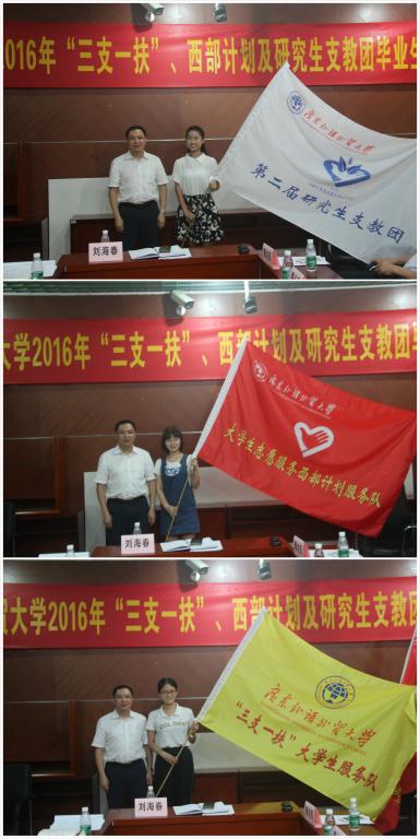 最后,刘海春为“三支一扶”、西部计划及研究生支教团志愿者服务队授旗,并向所有的毕业生赠送纪念品。