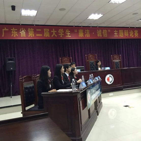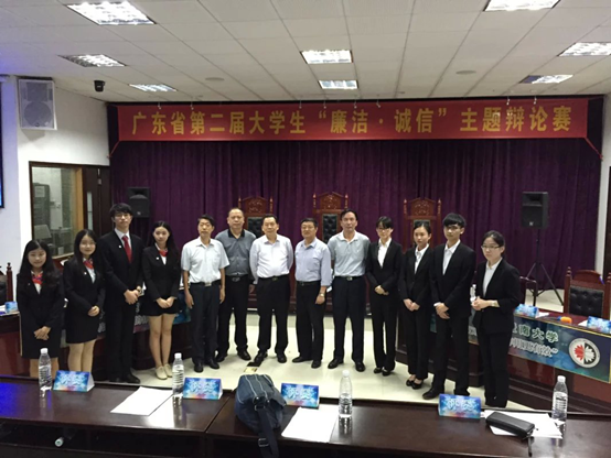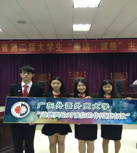 本网讯 4月25日下午,由省委教育工委、省教育厅、省教育纪工委主办的广东省第二届大学生“廉洁·诚信”主题辩论赛初赛在广东财经大学举行。广东外语外贸大学对阵暨南大学,就“道德舆论与法律约束何者对诚信的作用更大”展开激烈交锋。最终,我校辩论队以清晰的逻辑和充分的论证取得了本次比赛的胜利。我校纪委办公室副主任、检查处副处长李华和团委老师文金贝领队并现场观摩比赛。
