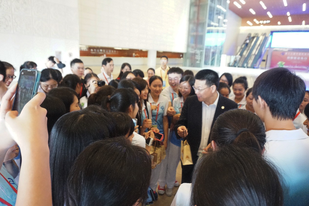 本网讯 5月24日,我校校长仲伟合来到白云国际会议中心慰问科协年会的志愿者,充分肯定志愿者的服务工作,并用“志愿者,最美丽”勉励志愿者。第十七届中国科协年会科普志愿者服务工作组执行委员会副组长、我校团委副书记(主持工作)苏奕和副书记余海波等陪同出席。