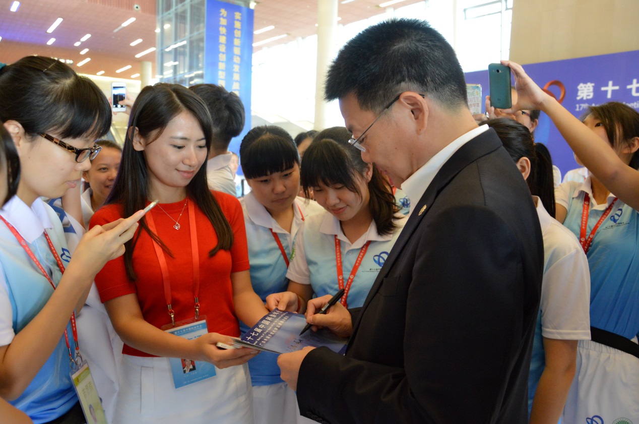 随后,仲伟合代表学校向连日来辛苦工作的志愿者赠送慰问品,并题字“志愿者,最美丽!”,并鼓励志愿者再接再厉,充分发扬志愿者精神,继续做好科协年会的服务工作。