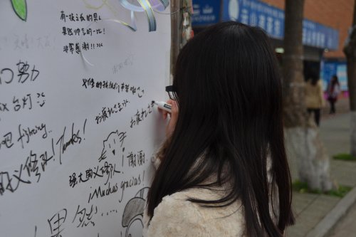 活动接近尾声时,为了感谢义修队伍细致而热情的服务,很多同学都在展示板上写下了自己衷心的感谢。