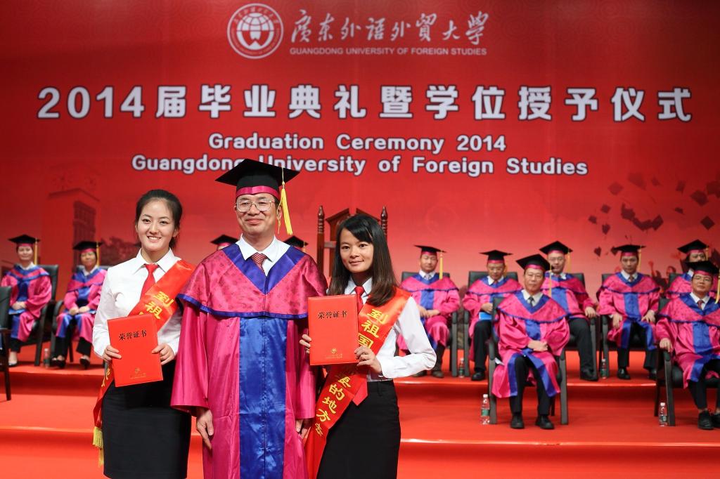 在毕业典礼上何传添副校长为西部计划志愿者冉娜娜、林茂惠颁奖
