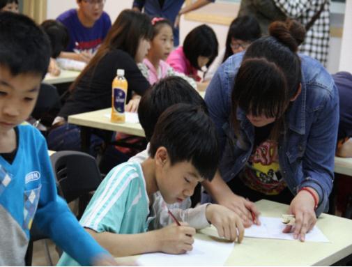 志愿者耐心辅导社区的小朋友们