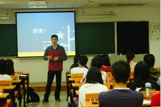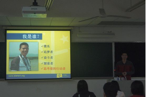 4月2日晚,由校团委青年志愿者行动指导中心举办的志愿大讲堂第二讲在南校区F209举行。广外08届商英学院校友、满天星青少年公益发展中心首席执行官梁海光受邀以“思考着的行动者”为主题展开演讲。 我是谁:“傻瓜、追梦者、奋斗者、探索者” “傻瓜、追梦者、奋斗者、探索者”这四个词是梁海光对自己的评价的关键词。喜欢《阿甘正传》的梁海光说自己是现实版的阿甘,热情不灭,不跑便不止,他就是一直在公益这条道路上不懈地追寻着自己的梦想。梁海光也相当认同“天道酬勤”这句话,他说自己一直都不是一个聪明的人,但他却是一个很勤奋很努力的人,他每天至少会工作16小时。对于朋友们的劝告,他认为最重要的是清楚自己正处于什么人生阶段,既然他不聪明,能力也不足,那就要比他人更努力,才能达到自己的目标。在中国做公益是一件很难的事,而作为“探索者”的他,回忆起初投身公益事业时,也曾迷茫过,但他认为一定要有信心,才能不断地探索下去。