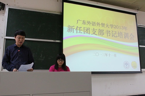 11月9日下午,广外2013年新任团支部书记培训会在北校二教217举行,本次会议由校团委副书记刘勇主持,大会在奏唱国歌中拉开了帷幕。此次培训会旨在培训新任团支书们,使其能够在接下来的一年中更好开展团工作,更好地服务同学。
