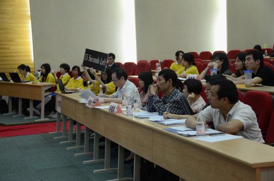 模拟新闻记者招待会为比赛第一环节。每场招待会由两组参赛队伍合作竞技,分别担任发言方与译员方。发言方接受现场记者针对社会热点的提问,译方则全程连续传译。六个小组分别以2011工业通信业发展和2011发展形势、中国举办2012年春运形势和工作、中国政府建立打击侵权假冒工作机制情况等题目模拟进行记者招待会,慷慨陈词,从容不迫,展现了广外学生良好的英语水平和自信阳光的风采。其中,D组和E组的同学侃侃而谈,妙语连珠,思维清晰敏捷,博得全场观众掌声阵阵,并最终以280.5和282的高分成功晋级。