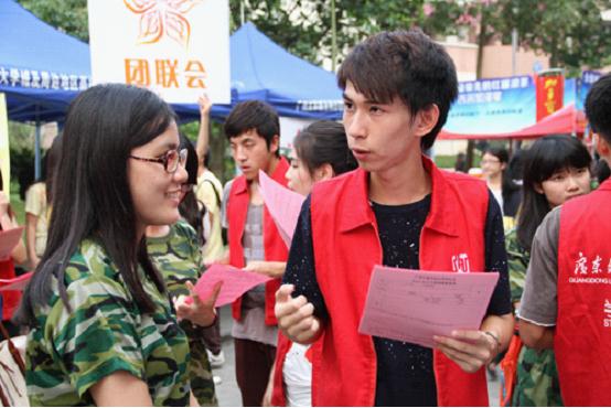 随后的新生越来越多,被吸引而来主动咨询和领取报名表的人也越来越多,工作人员们于是四散开来,分头为新生们详细讲解,一一介绍。新生初来广外,正是形成对学校的学生团体第一印象的时候,在场的每个工作人员得妙语连珠,极力想要展示自己团体的优势,招揽更多的“青年才俊”。