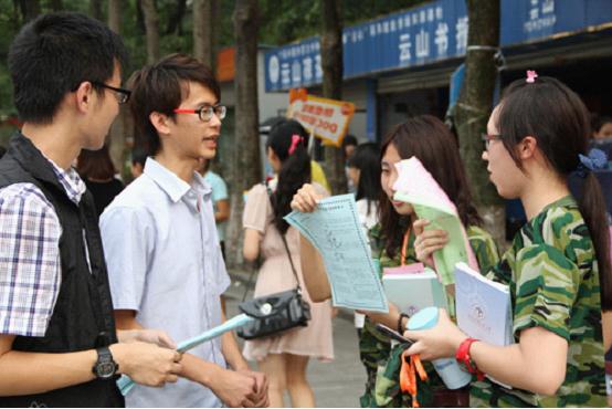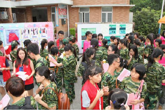 很快,下课时间到了,校道上开始出现路人的身影,但显然身着迷彩服的新生们才是学长学姐们的目标,几个走在前面的新生瞬间就被穿着各式工作服的社团工作人员层层包围,等包围圈散开时,他们手上已塞满了五颜六色的各式报名表。