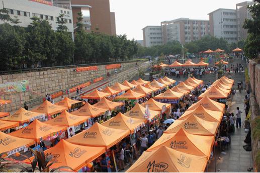 舞台下,27个团体的摆摊招新正在火热进行着,各式各样的招新活动令人目不暇接。在用心“打扮”后的摊位前,各个协会的成员们身着会服,活力充沛且详细地介绍着各自的协会,招兵买马。明德读书社有着浓厚的读书氛围;动漫协会的特色服装和各种Coplay造型夺人眼球;魔术协会现场表演魔术满足了人们的好奇心;摄影协会挂上了精美的摄影作品;ViBox Dv协会播放了唯美的微电影;环保协会和自行车协会摆出了自己制作的活动展板与照片;武协则秀出了收获的硕果—各大赛的奖牌与奖杯,令人惊叹……27个团体的辛勤付出得到回报,同学们的参与兴趣极大增强,场面热闹非凡。一名大一学生兴奋地说:“这就是我想要的大学生活!”