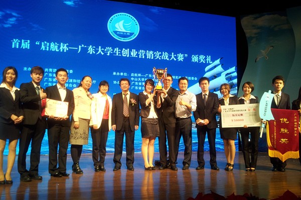 本网讯 12月15日下午,首届“启航杯——广东大学生创业营销实战大赛”颁奖礼在中山大学南校区梁球琚堂举行。团省委副书记陈小锋、省教育厅党组成员、副巡视员王玉学、广东省高校代表、部分参赛学生以及国内知名企业家等约1000人参加颁奖礼。我校学生就业指导中心主任赵烨、学生处副处长黄晓梅、校团委社会实践部部长余海波带队参加了此次颁奖活动。我校一举囊括三个团队奖及三个单项奖,在所有参赛高校中斩获最多。其中,我校Tearrific团队更是在激烈竞争中脱颖而出,获得了金奖,并且在最后与同获金奖的中山大学代表队“PK”环节中表现优异,勇夺“冠中冠”。