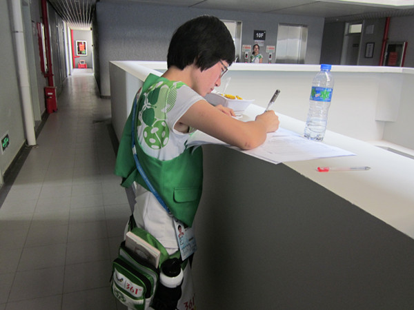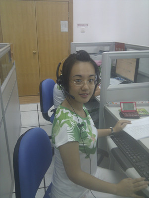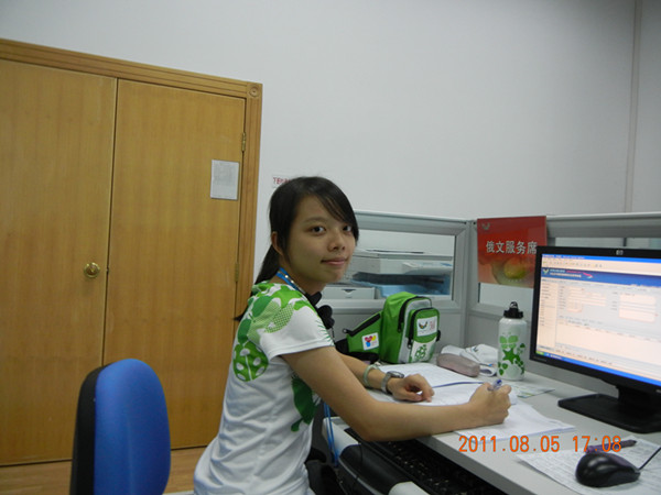 我们这边主要负责的是T3预订车辆服务,也就是为FISU大家庭中的贵宾订车。同时我们还肩负着投诉表扬及失物招领等工作。——西语学院09级西班牙语系陈蕾,小语种交通呼叫中心团队