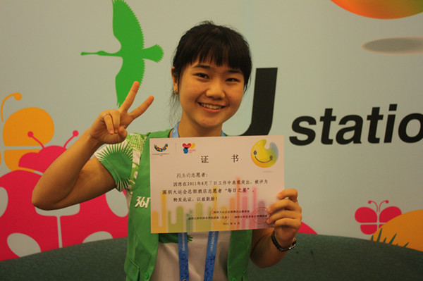我是今天的每日之星,我志愿,我快乐,我服务,我成长。接下来的每一天我都要保持积极的态度和乐观的精神,努力为大运奉献力量。——西语学院09级西班牙语系段苏玲,小语种五洲宾馆志愿者团队