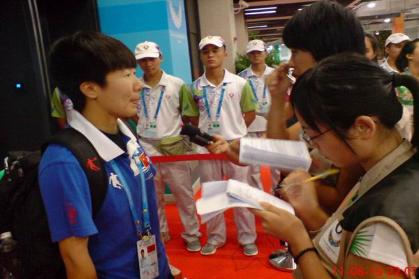 新闻发布会后,我校UNS志愿者前往混合区采访两国女足队员。当看到中国队队长毕妍走过来时,UNS志愿者郑皓莹及时抓住机会对她进行了采访。此前,毕妍已经接受郑皓莹的两次采访,这次她依旧热情耐心地回答了各种提问。在问到关于提前出线的中国队参加本次比赛的心情时,毕妍说:“我们这次的确会比较放松,但我们是奔着争取小组第一的目标来打这场比赛的。”关于本场对手英国队,她认为英国队特别顽强,从不放弃,她们也想争取小组第三。英国队率先进球对中国队来说虽然有点影响,但只要中国队调整心态,绝对有信心能把分打回来。
