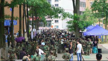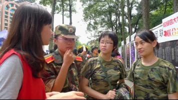 狭长的校道上是咨询和寻求报名表的学生们,贴有招新海报的展板前更是观者如云。四团的团体服装颜色各异,校团委和校团联的黄、校学生会的红、校艺术团的黑与新生们的草绿相映成趣,成为校道上一道道亮丽的风景线。