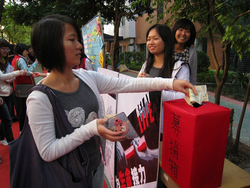 2011年12月1日下午2点,广外学生会在省学联的号召下开展了为22岁广州航海高等专科学校白血病患者柯达颖的爱心捐款活动。
