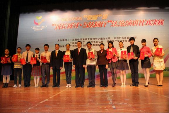 文字:校团委 图片:马海华 周旭培 本网讯 12月6日晚上,经过初赛、复赛的激烈角逐,以“成长成才·与法同行”为主题的全省大中学生“乾图”杯法治演讲比赛决赛在广州珠江宾馆会议中心顺利举行。省委常委、常务副省长、省依法治省工作领导小组副组长肖志恒,省委常委、政法委书记、公安厅厅长、省依法治省工作领导小组副组长梁伟发,省人大常委会副主任、省依法治省工作领导小组副组长兼办公室主任陈小川等领导出席了颁奖仪式。