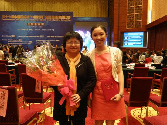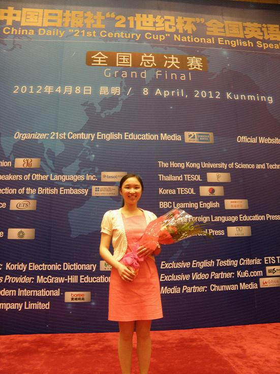 4月8日,第十七届中国日报社 “21世纪杯”全国英语演讲比赛总决赛在昆明的云埂会堂圆满落幕。经过3天的角逐,由我校陆璐老师和余蕾老师指导的商英学院大二学生沈家慧最终获全国一等奖。同时,沈家慧将获得前往美国、澳大利亚或香港、澳门修学访问的机会。