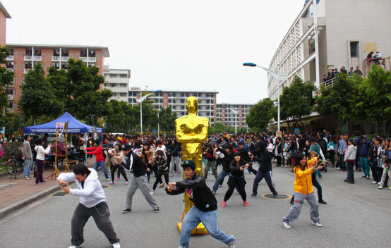 首先,伴随着充满激情的跳动的音乐,UC舞队围着“小金人”跳起了精彩的街舞。平静的校道一下子变得轰动活跃起来,来往的同学都纷纷停下了脚步,美滋滋地欣赏着这场“意外”的表演,脸上充满了新鲜感。然后,团学的成员慢慢地融进舞队去,整个队伍越来越大,载歌载舞!学生们把校道围得水泄不通,连在宿舍的同学也兴致勃勃跑出阳台观望。就这样,舞队掀起了大概持续10分钟的热潮,最后高喊着"DVNEWSCCAR”结束了活动!