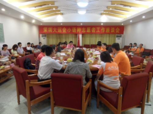 本网讯 5月7日,深圳大运会小语种志愿者工作座谈会及小语种志愿服务工作宣讲会在我校隆重召开,团省委学校部部长张文杰、部长助理黄瑞轸、朱瑞峰,省学联助理主席杨德鑫,深圳团市委副书记、深圳大运会志愿者工作协调小组办副主任、大运会执行局副局长张志华,深圳团市委学少部部长、深圳大运会赛会志愿者中心主任吴华根,志愿者组组长熊剑波,志愿者组副组长邓珊珊,中山大学及华南师范大学师生代表,我校党委副书记许国彬,校团委书记谢秀兰,校团委副书记陈兵,校团委青年志愿者行动指导中心主任余泽浩,西语学院团委书记李媛及我校大运会小语种志愿者推荐人员等参加了活动。
