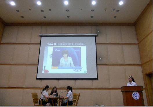 5月12日下午2:00,广外大第十一届英语综合技能大赛复赛在南校区图书馆二楼报告厅拉开了序幕。二十支参赛队伍在经历了学院选拔赛和海选后,齐聚复赛舞台切磋比拼,尽显“英技”。 此次复赛的形式为Con-con三人行。队伍代表抽选播放一个相关主题介绍的视频。视频播放完毕后,队伍低年级选手进行介绍和翻译视频主题。翻译结束后,由该低年级选手担任主持,引出Con-con三人行嘉宾。嘉宾由一名中国老师与一名native speaker担任,他们根据话题稿内容展开交谈讨论,两名队员分别作为中方老师的英文翻译和英方老师的中文翻译。